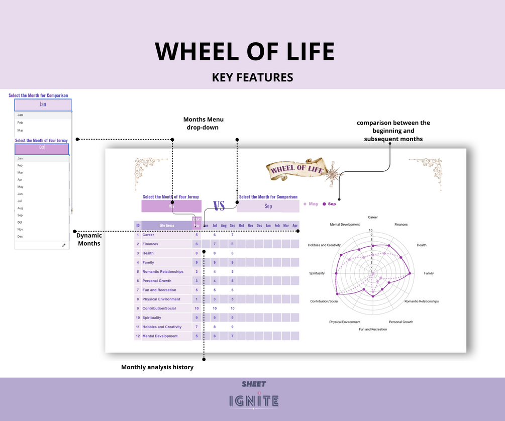 - Effective Monitoring: Track your progress monthly and see clearly how each area of your life evolves.