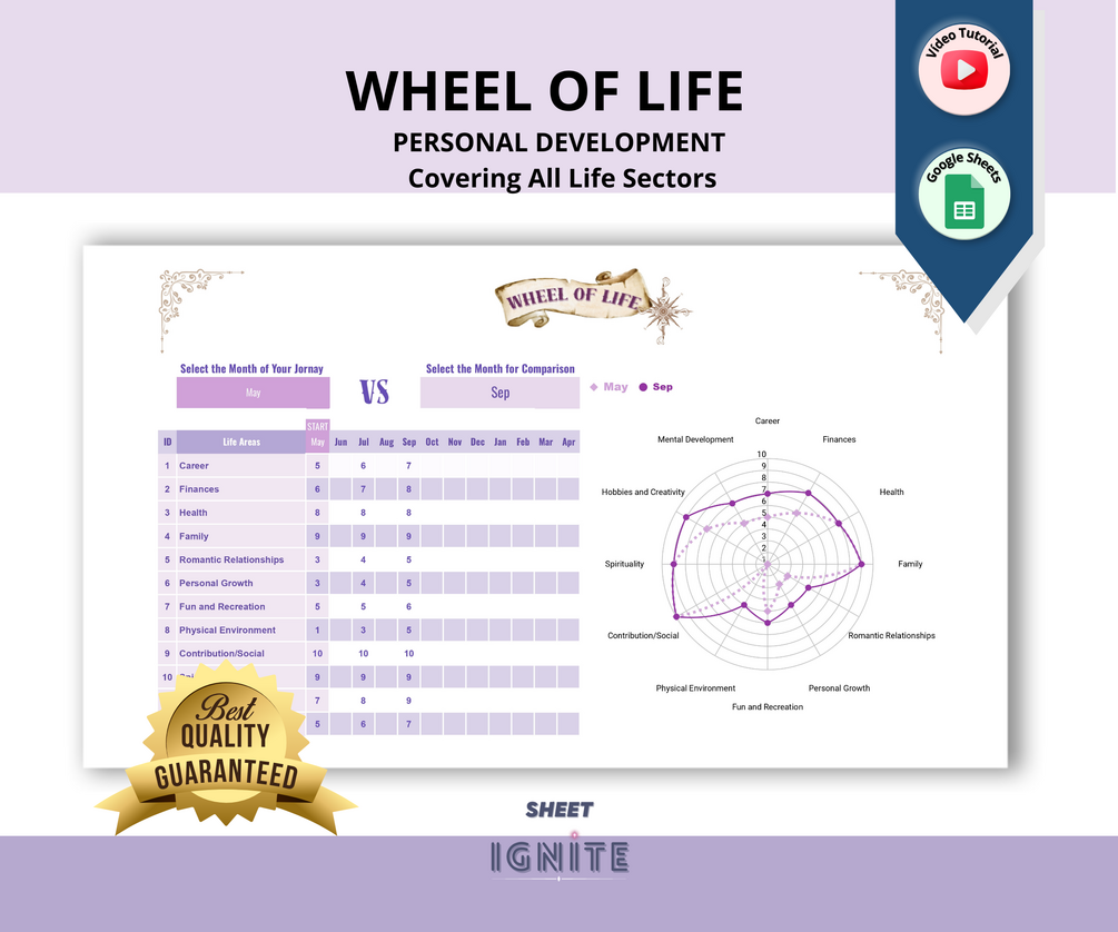 The Wheel of Life Template is a comprehensive, editable Google Sheets tool designed to help you assess and balance various aspects of your life. Ideal for self-care, life coaching, and personal development, this template covers all key life sectors, including health, finances, relationships, and more. Use it to identify areas of improvement, set goals, and track your progress for a well-rounded, fulfilling life. Perfect for coaches and individuals seeking a holistic approach to life balance. It consists of 5 tabs: