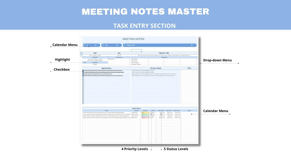 Introducing the Meeting Notes Template – your ultimate solution for organizing, planning, and conducting meetings with unparalleled efficiency. This comprehensive tool is meticulously designed to simplify the planning process, support decision-making, and elevate your overall meeting experience. With a clear structure and intuitive functionality, this template offers an efficient platform to ensure your meetings are not just productive but also successful.