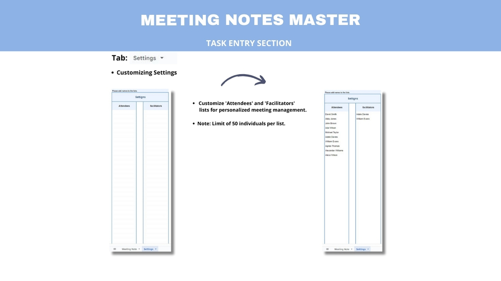 Use the "Settings" tab to customize participant and facilitator lists. Support for up to 50 individuals per list.