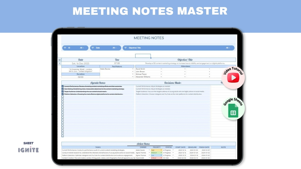 Meeting Notes Template, Google Sheets Tool, Action Item Planner, Business Meetings Support