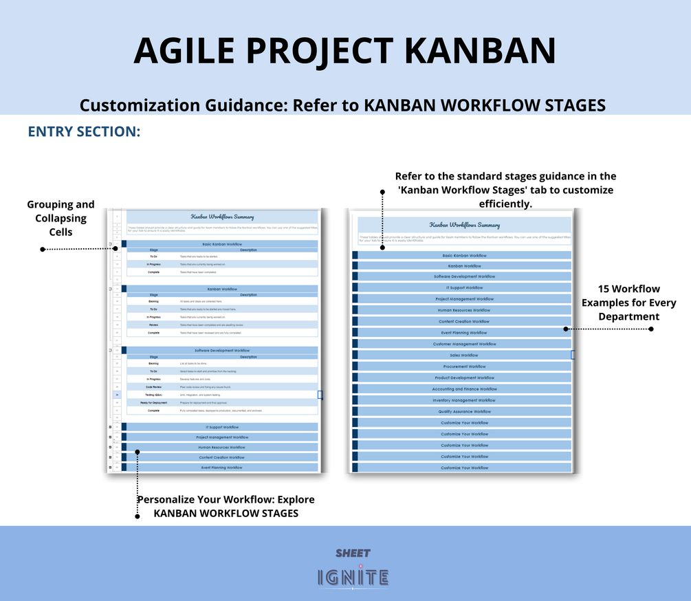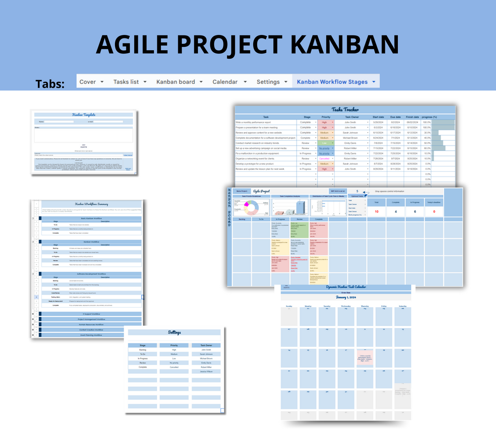 → 6 Spreadsheet Tabs: Cover, to-do list, kanban board, calendar, settings and, Kanban Workflow Stages.